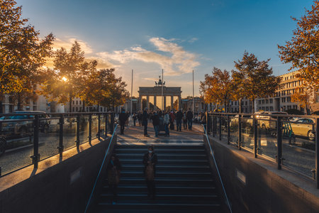 Berlin, Germany - 06.09.2018. Famous Brandenburger Tor (Brandenburg Gate) in beautiful golden morning light at sunrise.