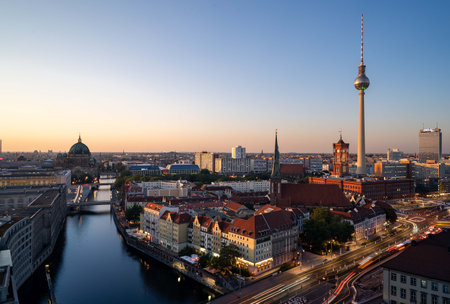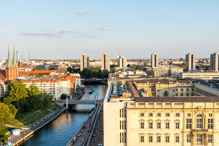 Cityscape of downtown of Berlin with modern skylines at the riverbank of Spree River and church towers under sunset. Aerial view from Berlin Cathedral.