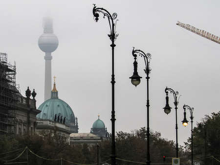 View of Berlin Cathedral and TV tower on a foggy morning. Berlin, Germany.
