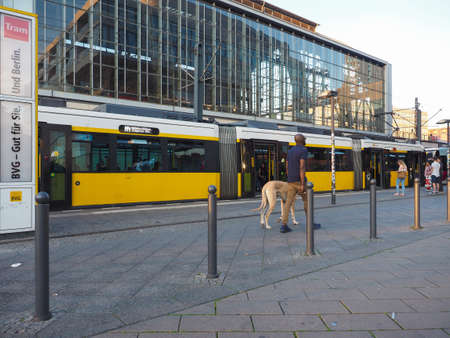 Berlin, Germany - June 26, 2016: Yellow tram in Berlin Mitte, Germany. Tramway public transport