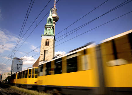 Moving commuter train and the famous Television Tower in Berlin