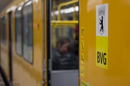 Berlin, Germany - march 30, 2016: Closeup of the public transportation company logo (BVG) and the berlin emblem (berlin bear) on metro train.