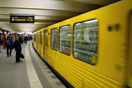Yellow subway train in Motion. Berlin Alexanderplatz sign visible on the wall of underground station.