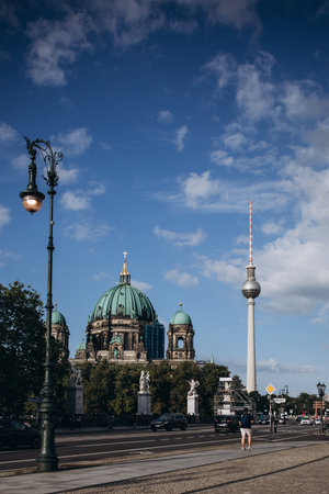 Scenic view of Berlin Cathedral and TV Tower on a sunny day with street life.