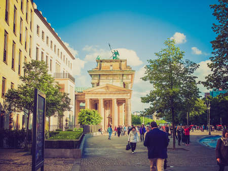 Vintage looking BERLIN, GERMANY - MAY 11, 2014: Tourists visiting the Brandenburger Tor (Brandenburg Gate) linking East and West Berlin