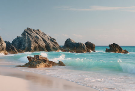 Turquoise waves crash onto a sandy beach with large rock formations under a light blue sky
