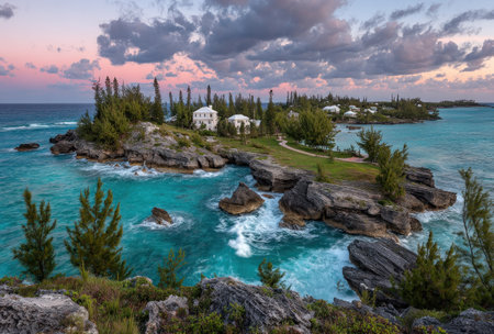 Coastal island scene with turquoise water, cliffs, greenery, buildings, and dramatic sunset sky