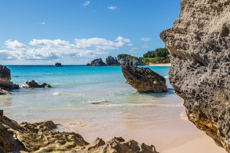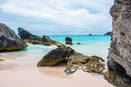 Rocks and the sandy beach at Horseshoe Bay, Bermuda