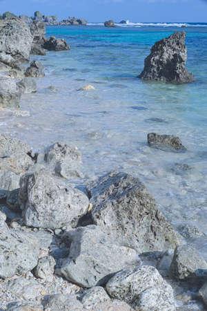 Crystal clear water amidst rocks and sandy beaches of North Biminis west coast in Bahamas.