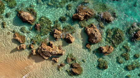 Top-down view of scattered rocks in a shallow turquoise sea with sandy seabed below