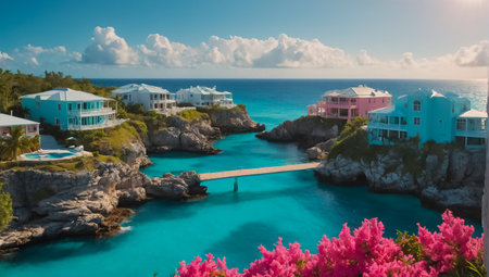 Panoramic aerial view of beautiful tropical island with azalea flowers and wooden bridge.