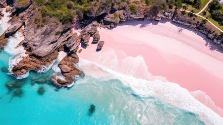 Aerial view of Pink Beach with green color on the hill and turquoise sea from Komodo Island Labuan Bajo