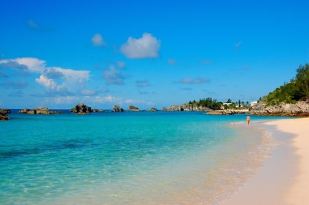 A photograph of a beach on the island of Bermuda, with a rock formation jutting into the sea