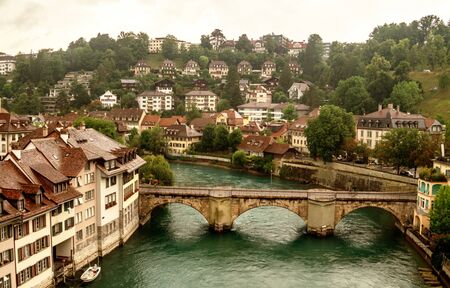 View of the Old City of Bern with the bridge Untertorbryukke over Aare river. Berne, Switzerland
