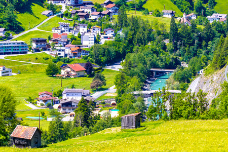 Mountain and alpine hill landscape mountains and peaks panorama view to Nesselgarten village town forest huts houses streets turquoise river Inn and green fields in Austria.