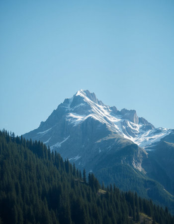 Sunlit mountain peak with snow and forest under a clear sky