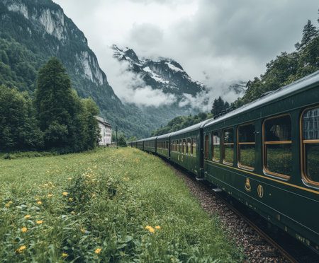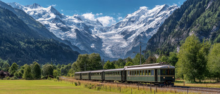 Scenic mountain train journey through lush green valley.