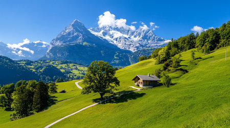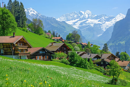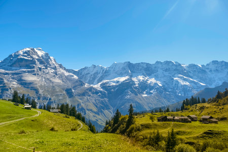 Majestic mountains soar against a bright blue sky, showcasing snow-capped peaks. Lush green meadows and quaint cabins create a serene atmosphere in Switzerland Lauterbrunnen Valley during autumn.