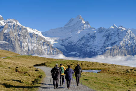 Young couple hiking in panorama trail leading to Kleine Scheidegg from Mannlichen with Eiger, Monch and Jungfrau mountain (Swiss Alps) in the background, Berner Oberland, Grindelwald, Switzerland.