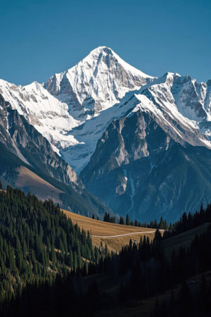 Mountain landscape with snowcapped peaks and coniferous forest