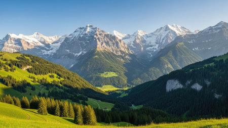 Alpine landscape with snow-capped mountains and meadows, Switzerland