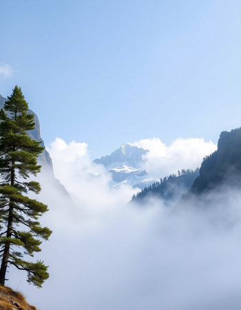 Mountain landscape with fog and pine trees in the foreground, Switzerland