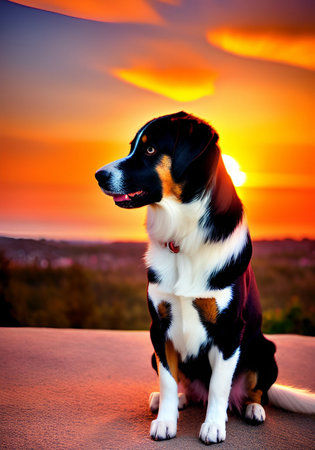 portrait of a large beautiful dog with his tongue hanging out against the sky, Bernese Mountain Dog bottom view, love to the animals