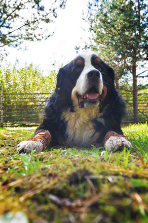 Bernese Mountain Dog (Berner Sennenhund) lying in the middle of a green lawn on a sunny summer day