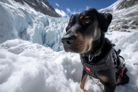 A dog stands on snow with a glacier backdrop under a clear blue sky, enjoying the mountain adventure.