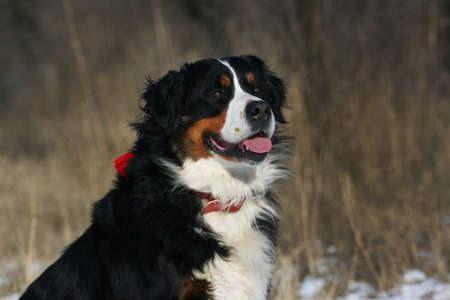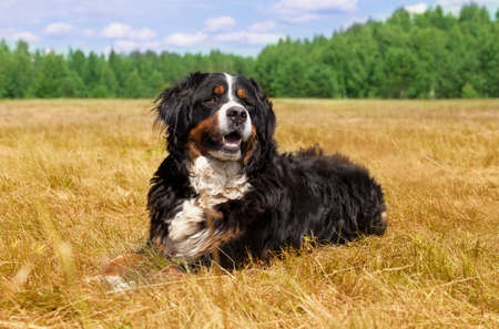 Close up Portrait of bernese mountain dog standing in the yellow field and looking away