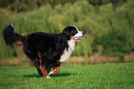 Beautiful Bernese mountain dog runs are fun in the summer outdoors on the field