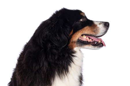 Head shot of pretty adult Bernese Mountain dog, sitting up. Looking to the side away from camera. Isolated on a solid white background.