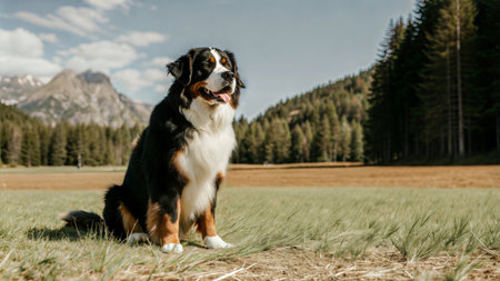 A Bernese Mountain Dog sits in a field, with mountains and forest in the background.