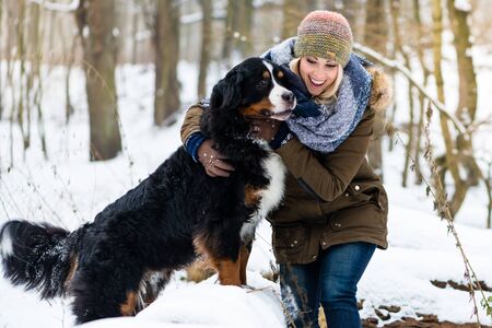 Woman walking her dog in the winter and both explore the snow together in playful mood