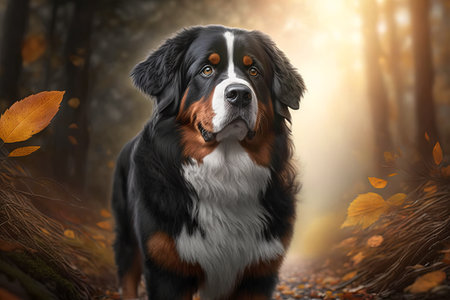 A closeup of a sweet Bernese mountain dog in an autumnal forest