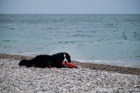 Charming Bernese Mountain Dog spends its vacation by sea and enjoys life. Dog is lying on beach and guarding its red toy ring. Portrait of fluffy mountain dog.