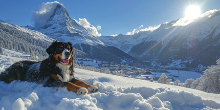 Bernese mountain dog on the background of the snowy mountains, Switzerland