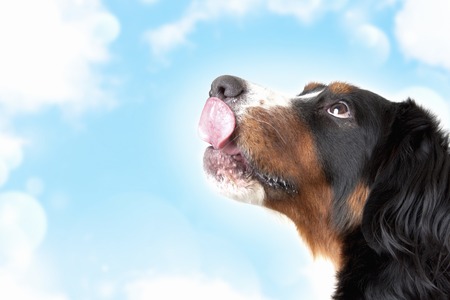 portrait of a large beautiful dog with his tongue hanging out against the sky, Bernese Mountain Dog bottom view, love to the animals