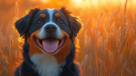 Portrait of a Bernese Mountain Dog in the field at sunset