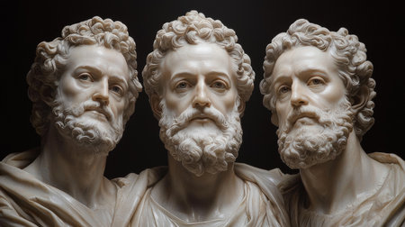 Three majestic figures dressed in flowing white robes embody Holy Trinity, each radiating unique grace Their serene expressions and glowing presence highlight their sacred unity