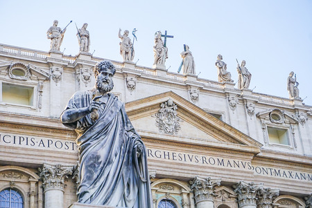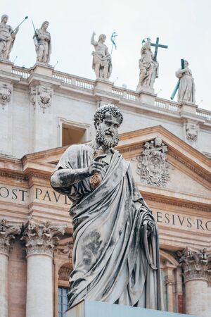 Saint Peter with Eden key against the blue sky background. The close-up of sculpture near St. Peter's Basilica.