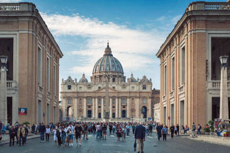 Rome, Italy - October 2019: View from Via della Conciliazione (Road of the Conciliation), one of historic street in Rome, Italy, towards St. Peter's Basilica in Vatican City