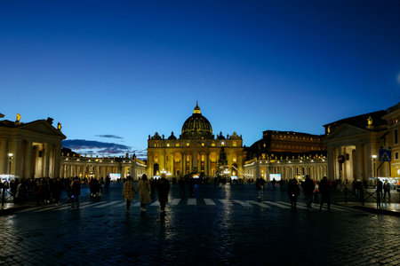 Vatican, Vatican City - December 7, 2023: Panoramic night view of St Peters Basilica with beautiful reflection in Vatican City. Architecture, landmark and attractions of Rome, Italy. High quality photo