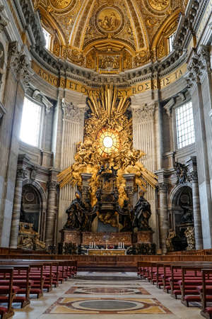 VATICAN - November 11, 2018: Inside the St. Peters Basilica, Rome, Italy. St Peters church San Pietro is one of the main landmarks in Rome. St Peters interior in sun rays.