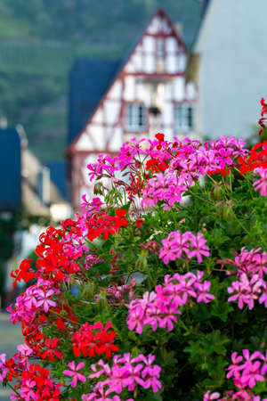 Cozy European street view with old buildings and summer floral decoration in Beilstein, Germany