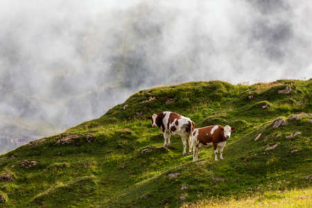 A close up of a brown cow with a broken horn looking straight to camera during a stormy day in the middle of the mountains