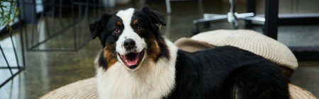playful Australian Shepherd relaxes happily on soft couch in living room, banner