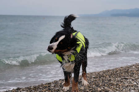 A rescue dog stands on pebble beach and shakes off that spray is flying in different directions. Bernese mountain dog in bright green life jacket at sea.