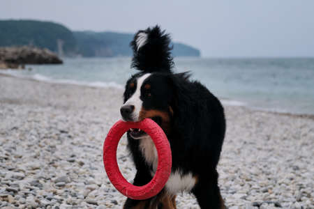 Charming Bernese Mountain Dog spends its vacation by sea and enjoys life. Dog runs along pebble beach and plays with red toy ring merrily. Active games with mountain dog in nature.
