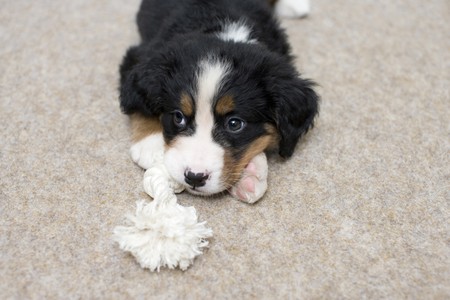 Bernese Mountain Dog puppy stuck out its tongue. High quality photo